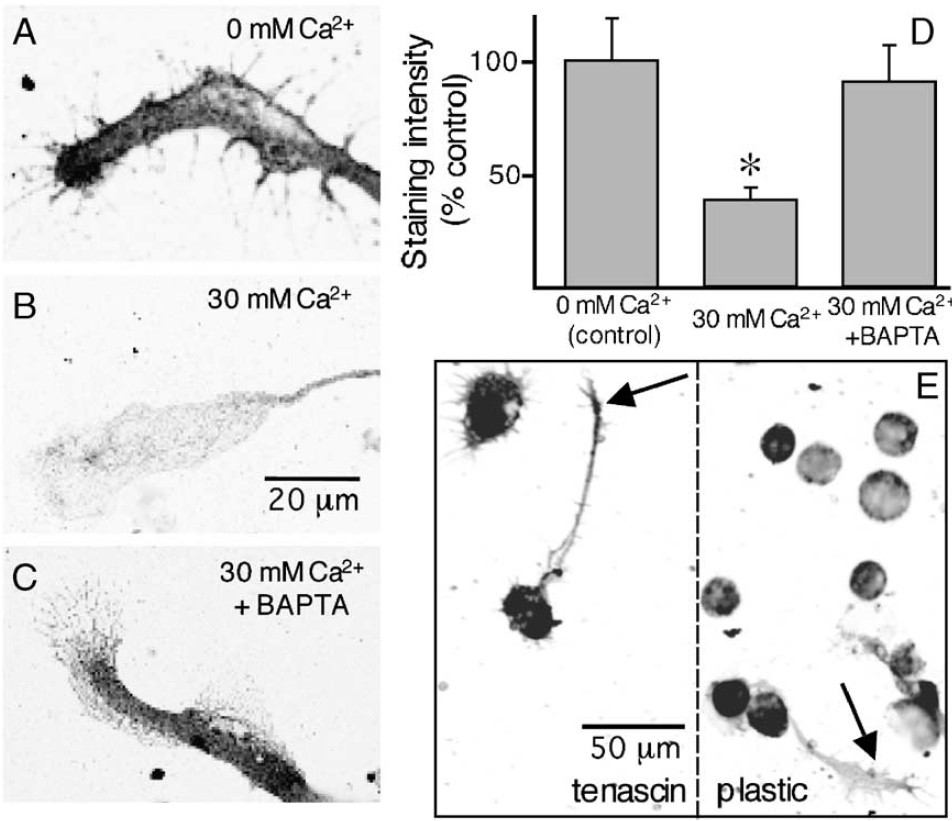 different from 0 mMCa2+ and 30 mM Ca2+ plus BAPTA (p < 0.05). (E) pFAK staining is more intense in cells grown in 2 mMCa2+ on tenascin where LLTs are absent