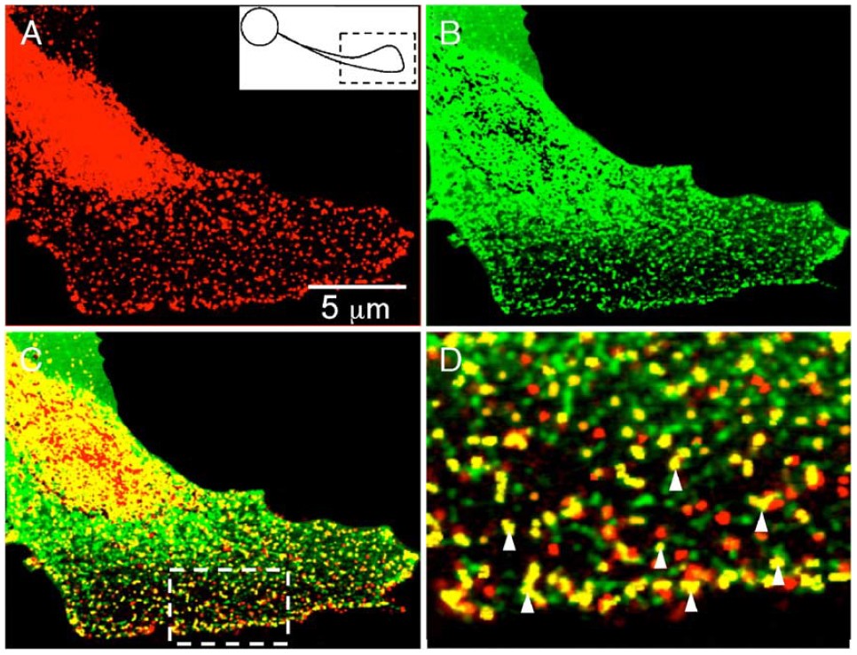 Fig. 5. pFAK immunoreactivity colocalization with focal complexes in lamellipodia. (A, B) Images of the growth cone of a cultured neuron fixed and stained for