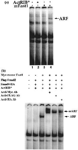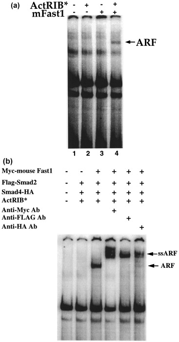 Fig. 2. Participation of Fast1 in ARF complex. (A) cDNA encoding Fast1 was transfected into 293 cells in the presence or absence of activated Type I activin receptor (ActRIB*), cells were lysed and assayed for ARF activity by EMSA. (B) cDNA encoding Myc-tagged Fast1 was transfected into 293T cells in the presence of ActRIB* and epitope tagged Smad2 and Smad4. Lysates were incubated with anti-epitope antibodies indicated and assayed by EMSA. ssARF (supershifted ARF) denotes ARF complex shifted in mobility by binding of anti-epitope antibodies to tagged ARF components. No supershifts were observed when antibodies were added in the absence of epitope tagged Smads or Fast1 (not shown).