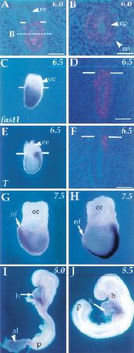 Fig. 6. Expression of Fast1 during early mouse embryogenesis. Localization of Fast1 and murine T transcripts in 6.0â8.5 dpc embryos, as revealed by whole-mount and section in situ hybridization. (A) Section through a 6.0 dpc pre-gastrulation stage embryo showing Fast1 expression in the epiblast, but not in the extra-embryonic ectoderm. Solid line shows the junction between the two regions. (B) Transverse section of an embryo at the same stage, at the level indicated in (A), showing Fast1 expression throughout the epiblast and probably the embryonic endoderm. (C-D) 6.5 dpc embryo from the same litter as (E,F) probed for Fast1. Fast1 transcripts are still present throughout the embryo, which has initiated gastrulation, but not in the extra-embryonic ectoderm. (E,F) T (Brachyury) expression is detected in the primitive streak at the posterior of the embryo. (G) At 7.5 dpc, Fast1 is ubiquitously expressed in the developing embryo, while T transcripts are localized to the notochord and primitive streak (H). (I,J) At 8.0 and 8.5 dpc, Fast1 expression is strongest in the heart and allantois, while low levels are visible in the notochord and posteriormesoderm. Branchial arch (b); heart (h); epiblast (ep); embryonic endoderm (en); extra-embryonic ectoderm (ee); allantois (al); neural folds (nf); presomitic mesoderm (p).
