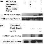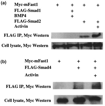 Fig. 3. Regulated co-precipitation of Fast1 with Smad2 and Smad4. Epitope tagged Fast1 or Smads were expressed by mRNA microinjection into Xenopus embryos in the presence or absence of activin. Embryos were harvested and immunoprecipitated with the anti-FLAG antibody, Fast1 co-precipitation was then detected by anti-myc tag Western blotting. Bottom panels confirm equal expression of tagged Fast1 in whole cell lysates. (A) Activin stimulates co-precipitation of Smad2 with Fast1, but BMP4 does not stimulate Smad1 co-precipitation of Fast1. (B) Activin stimulates co-precipitation of Fast1 and Smad4.