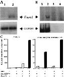 Fig. 7. Expression of Fast1 and endogenous ARE-luciferase responsiveness in P19 cells. (A) Northern analysis measuring Fast1 mRNA levels in NIH 3T3 cells (lane 1) and P19 cells (lane 2). (B) RT-PCR measuring Fast1 mRNA levels in NIH 3T3 cell (lane 1) and P19 cells (lane 2). As a control, RT-PCR was done on cellular RNA in the absence of reverse transcriptase (lane 3). A water blank is shown in lane 4. Levels of GAPDH were measured for both Northern analysis and RT-PCR as an internal loading control. C) Endogenous ARE responsiveness of P19 cells versus NIH 3T3 cells; P19 cells were transfected with the multimerized ARE Luciferase reporter construct A3, and or ACTRIB*, and Fast1. The background is defined as the Luciferase activity from cells transfected with the ARE-Luciferase reporter construct alone. The results are of a representative experiment, performed in triplicate.