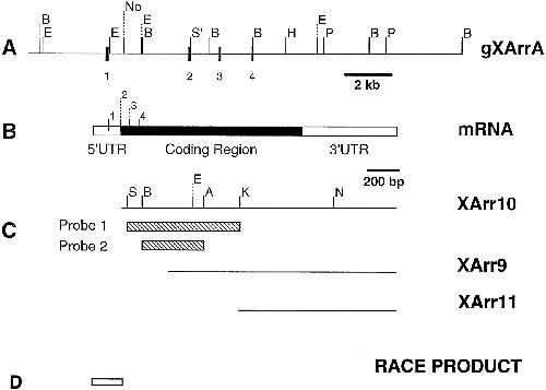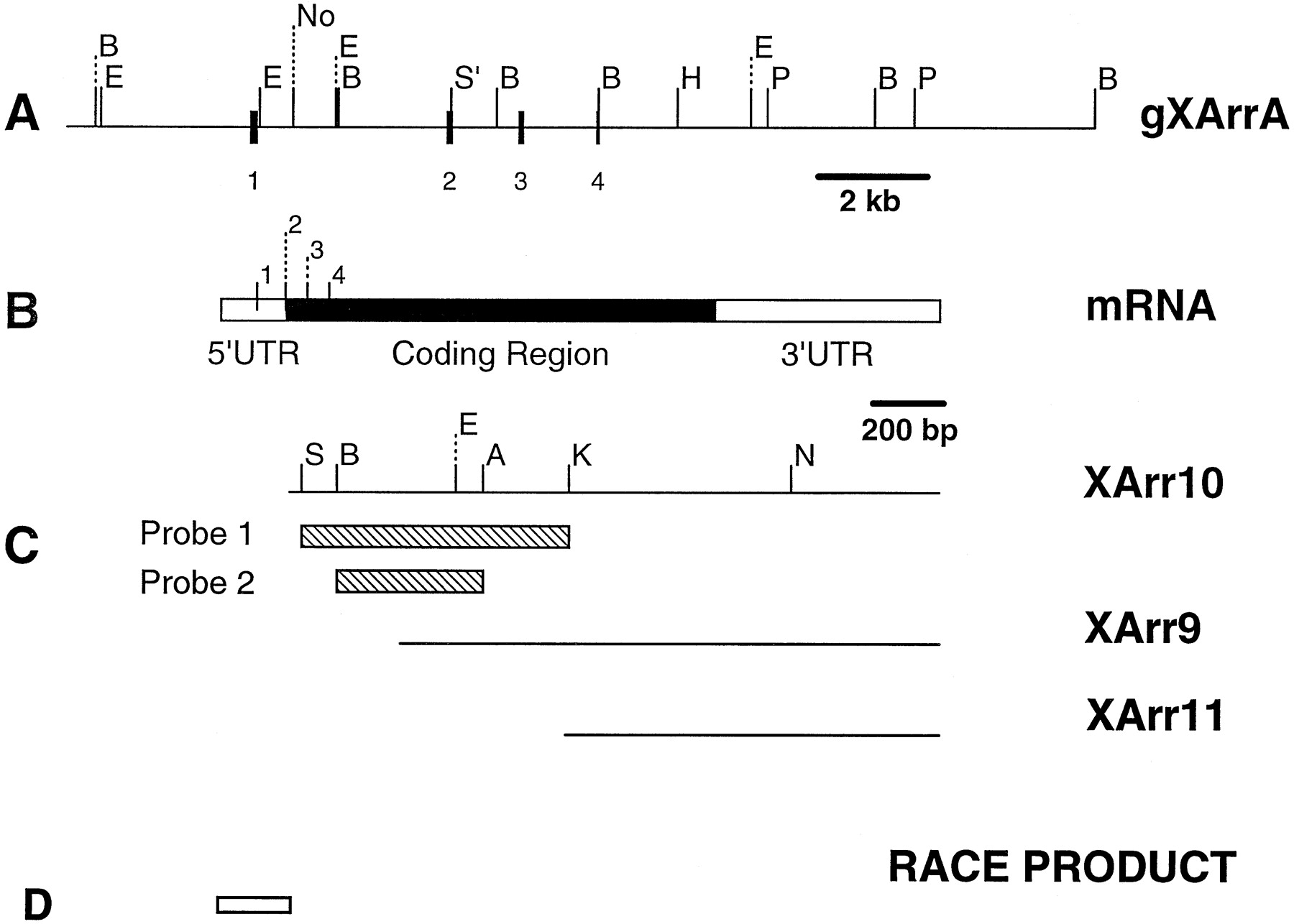FIG. 1. Xenopus rod arrestin genomic and cDNA clones. A, restriction map of partial genomic clone gXArrA. The exons 1, 2, 3, and 4 are indicated by solid boxes. Restriction sites shown are BamHI (B), EcoRI (E), NotI (No), HindIII (H), PstI (P), SmaI (S9, additional SmaI sites exist in the fragment but were not mapped), AvaI (A), KpnI (K), and NcoI (N). B, structure of the 1978-bp transcribed product with the coding region (solid box) and the UTR (open boxes) indicated. The positions of first four introns are indicated. cDNA clones (Xarr10, 9, and 11) (C) and a 250-bp RACE product used in sequence determination (D) are shown. Probes used for genomic screening and Northern analysis (Probe 1) and Southern analysis (Probe 2) (see âExperimental Proceduresâ) are indicated by hatched boxes.