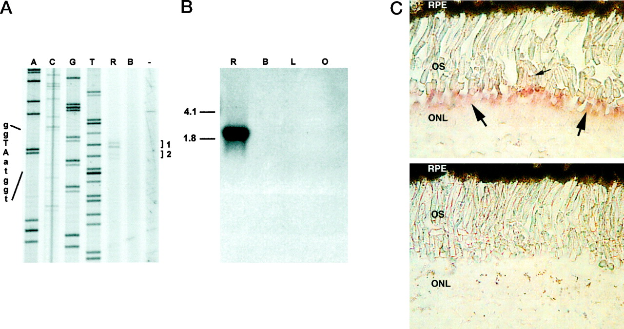 FIG. 2. Arrestin transcript analysis. A, primer extension of total RNA (15 mg) of retinal (R), brain (B) RNA, or no RNA (2). A sequencing ladder using the same primer is shown. The major transcription start site is indicated by 1, and the corresponding nucleotides are represented in capital letters. 2 represents minor extension products. B, Northern analysis. 0.2 mg of Xenopus adult retinal poly(A)1 RNA (R) and 10 mg each of total RNA from brain (B), liver (L), and olfactory bulb (O) were resolved on a 1% denaturing agarose gel, and hybridization was performed using probe 1. Molecular markers corresponding to ribosomal RNA are indicated. C, localization of rod arrestin mRNA by in situ hybridization. Fixed sections of adult Xenopus retina were hybridized with a digoxigenin-labeled antisense (top) or sense (bottom) Xenopus rod arrestin probe under high stringency conditions. Bound probe was visualized using anti-digoxigenin antibody. Staining with the antisense probe was detected exclusively in rods (large arrows, A). No staining was detected in cones (small arrow, A) or with the sense probe (bottom). RPE, retinal pigment epithelium; ONL, outer nuclear layer.