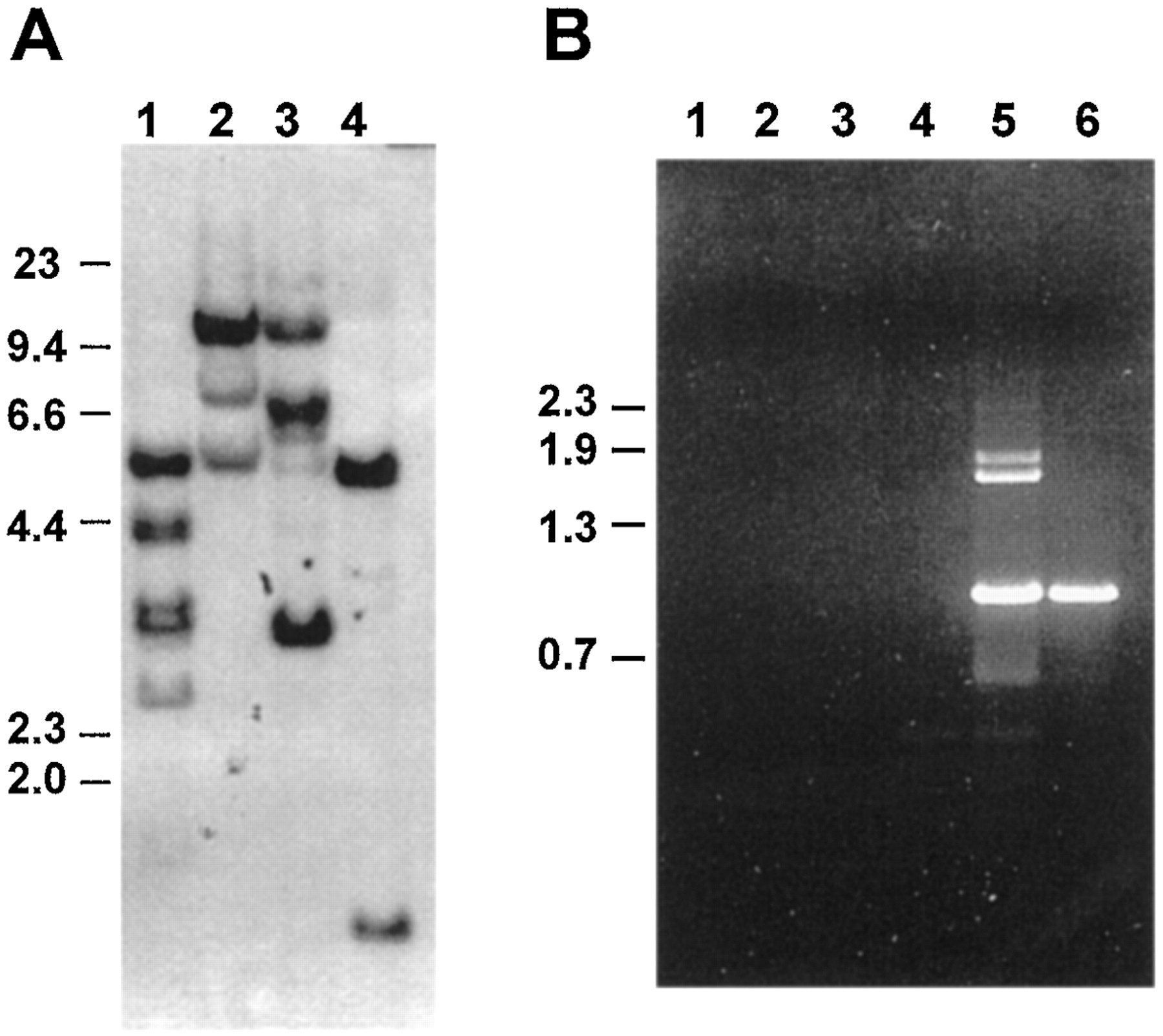 FIG. 3. Xenopus arrestin alleles. A, Southern blot of Xenopus genomic DNA (15 mg) digested with PstI (lane 1), HindIII (lane 2), EcoRI (lane 3), or BamHI (lane 4), hybridized with the BamHI-AvaI cDNA probe (probe 2), and washed at high stringency. B, PCR of intron 2 using Xenopus genomic DNA (200 ng, lane 5) or genomic clone gXArrA (40 pg, lane 6) was carried out using exon-specific primers. Lanes 1â4 are controls in which no primers (lane 1), forward primer alone (lane 2), P2 alone (lane 3), and forward primer and P2 but no genomic DNA (lane 4) are shown. The molecular size markers in kbp are indicated on the left.
