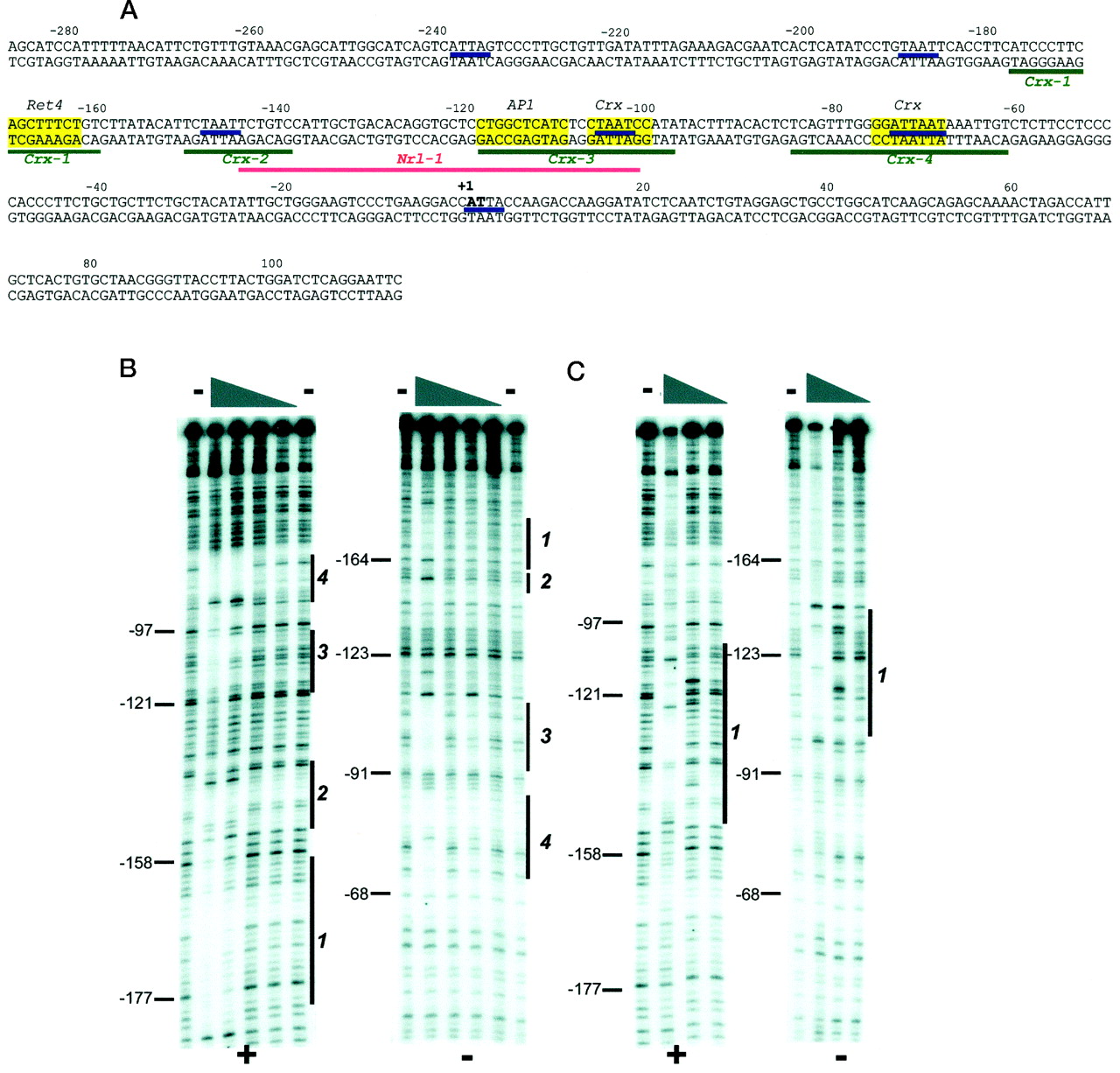 FIG. 4. Analysis of the Xenopus rod arrestin proximal promoter. A, the nucleotide sequence of the proximal promoter (2287/1113, pXAR7) is shown with the major transcriptional start site numbered 11 (bold). Potential transcriptional regulatory sequences (Crx, Ret4, and AP1) identified by sequence comparisons are shaded, and the homeobox core sequences (ATTA) are underlined. B, DNase I footprinting analysis using purified GST-CrxHD. Both top (1) and bottom (2) strand of the proximal promoter were footprinted in the absence (2) and presence of 100, 10, 1, and 0.1 ng of protein. C, DNase I footprinting analysis using purified His-Nrl. Both the top (1) and bottom (2) strand of the proximal promoter were footprinted in the absence (2) and presence of 140, 1.4, 0.14 ng of protein. The major protected areas from both B and C are indicated by numbered lines, and the corresponding regions are underlined below the sequence in A. Nucleotide positions were determined by comparing to a sequencing ladder adjacent to the DNase-treated samples and representative size markers shown.
