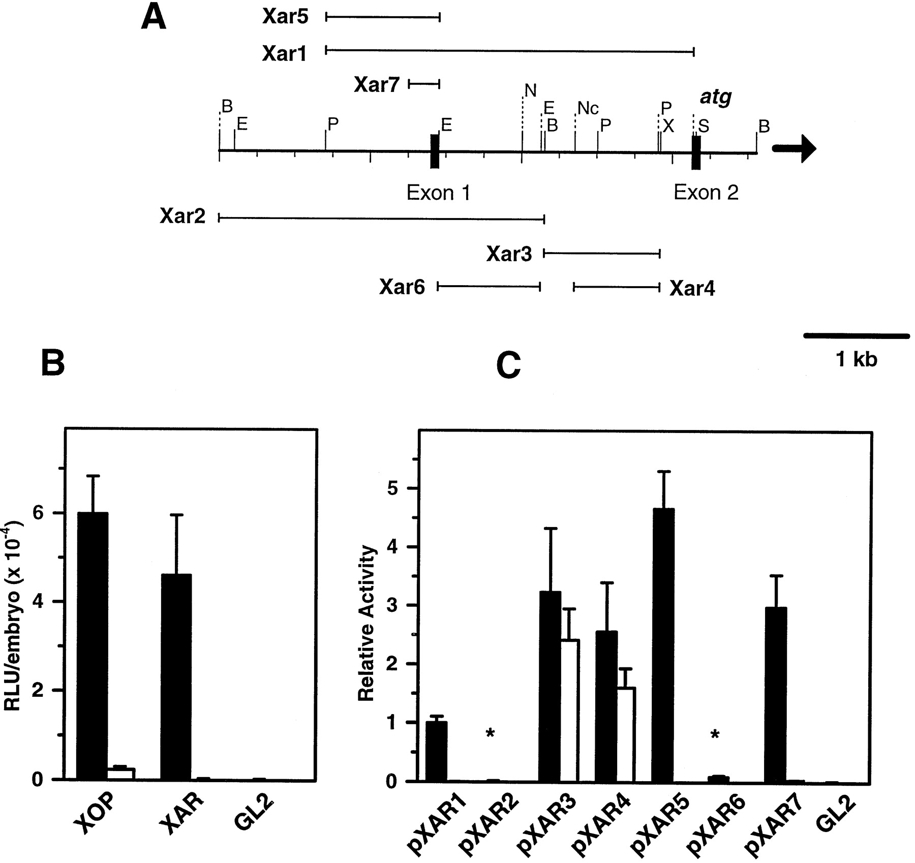 FIG. 5. Transient transfections of Xenopus embryos with arrestin constructs. A, transfection constructs. The 59 end of genomic clone (gXArrA) showing the positions of exons 1 and 2 (solid boxes) and direction of transcription (arrow) is shown. Luciferase reporter constructs are shown above and below (pXAR1â7). The translational initiation codon encoded by exon 2 is indicated (atg). Restriction sites used in the generation of reporter constructs are BamHI (B), EcoRI (E), NcoI (Nc), PstI (P), SmaI (S), XbaI (X). Additional NcoI sites in this fragment have not been mapped. B, transient transfection of Xenopus embryos. Luciferase activity (relative light units (RLU)/embryo) from transfections in heads (solid bars) or trunks (open bars) using XOP (Xenopus opsin promoter, 2508/141), XAR (Xenopus arrestin promoter, 21287/ 1130, in 1/3324, 1131/1155), or GL2 (promoterless control) were determined in 6 independent experiments. The activity measured from GL2 was not significantly different from controls without luciferase. Luciferase activity measured from heads transfected with XOP and XAR were 125- and 94-fold higher compared with activity measured from GL2 transfected heads. C, luciferase activities in heads (solid bars) or trunks (open bars) from various arrestin reporter constructs, normalized to XAR, were determined in 6â8 independent experiments. The sequence of pXAR7 is shown in Fig. 4A. Error bars represent S.E., and asterisks indicate values not statistically different (ANOVA, p , 0.05) from the promoterless control.