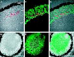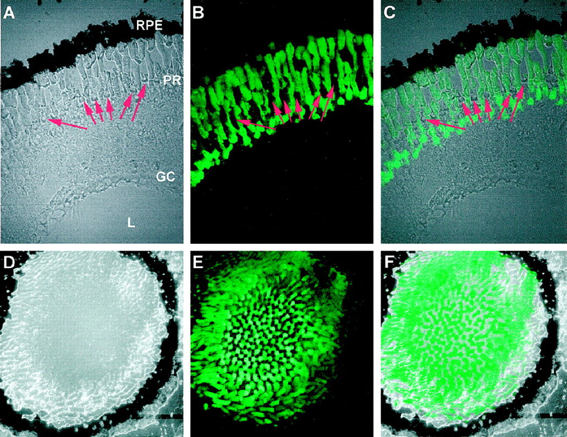 FIG. 6. Arrestin upstream/intron I sequences direct rod-specific expression of GFP in transgenic Xenopus tadpoles. A, bright field image of a radial cross-section through the central retina of a stage 56 transgenic tadpole generated using pXAR1gfp. The retinal pigment epithelium (RPE), photoreceptors (PR), ganglion cell (GC) layers, and lenses (L) are indicated, and cone cells in the PR layer are indicated by arrows. B, fluorescence image of the same section showing GFP expression limited to the rods. C, bright field and fluorescent lighting conditions showing no GFP expression in cone cells. GFP-positive rods are seen alongside GFP-negative cone cells (indicated by arrows). D, differential interference contrast image of a tangential cross-section near the peripheral retina of a stage-52 transgenic tadpole generated using pXAR7gfp. The darkly pigmented retinal pigment epithelium can be seen surrounding the rod outer segments; inner segments and photoreceptor cell bodies are in central portion of the section. E, fluorescence image of the same section. GFP expression can be seen in the rod outer segments and in the inner segments/soma of the rod cell mosaic. F, bright field and fluorescent images (D and E) were merged following acquisition of the same section. Nonexpressing photoreceptors can be observed adjacent to fluorescent rod cells.