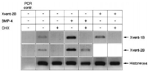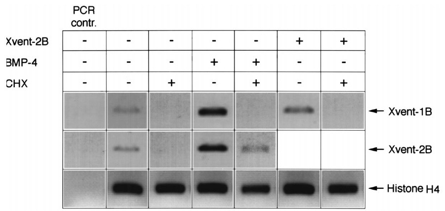 Fig. 7. Interactions between BMP-4, Xvent-2B and Xvent-1B in whole embryos in the absence or presence of cycloheximide (CHX). Four-cell stage embryos have been injected with BMP-4 RNA (300 pg) or Xvent-2B RNA (400 pg) into both dorsal blastomeres. Cycloheximide treatment started at stage 7.5 and embryos were cultured until stage 10.5. RT-PCR was performed with total RNA and has been adjusted using histone H4 as an internal control.