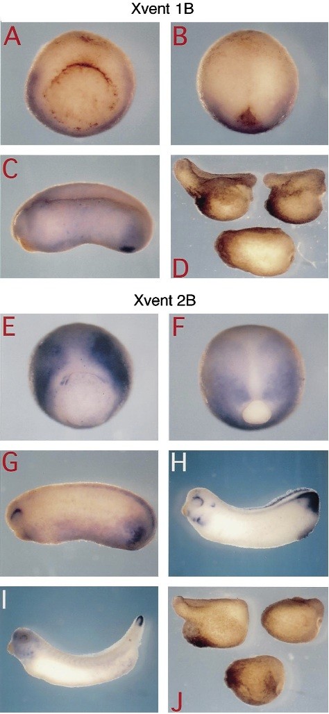 Fig. 2. Spatial transcription patterns and phenotypic effects observed after ectopic expression of Xvent-1B and Xvent-2B. Transcription patterns were analyzed by whole mount in situ hybridization of Xenopus embryos using Xvent-1B (A) or Xvent-2B (E) antisense RNA. Developmental stages shown for Xvent-1B are: 10.0 (A), 12.5 (B) and 23 (C); Xvent-2B: 10.5 (E), 12.0 (F), 24 (G), 29 (H) and 35 (I). Note that at early stages Xvent-1B expression is restricted more ventrally and lacks anterior expression in the eyes at later stages. Over-expression experiments were carried out by microinjection of either Xvent-1B (D) or Xvent-2B RNA (J) into the dorsal blastomeres of four-cell stage embryos which were then cultured until controls had reached stage 30. Note the complete ventralization and loss of all anterior structures after ectopic expression of Xvent-1B as well as of Xvent-2B.