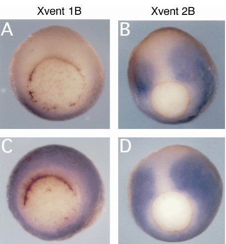 Fig. 5. Xvent-2B activates Xvent-lB but not vice versa. Xvent-1B (A,C) or Xvent-2B transcripts (B,D) have been analyzed by whole mount in situ hybridization after injection of 400 pg Xvent-2B RNA (C) or 400 pg Xvent-1B RNA (D) respectively. RNAs had been injected into the dorsal blastomeres of four-cell stage embryos. (A,B) Show uninjected control embryos. Note the activation of Xvent-1B in dorsal mesoderm.