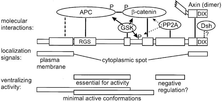Axin was identified as a regulator of embryonic axis induction in vertebrates that inhibits the Wnt signal transduction pathway. Epistasis experiments in frog embryos indicated that Axin functioned downstream of glycogen synthase kinase 3beta (GSK3beta) and upstream of beta-catenin, and subsequent studies showed that Axin is part of a complex including these two proteins and adenomatous polyposis coli (APC). Here, we examine the role of different Axin domains in the effects on axis formation and beta-catenin levels. We find that the regulators of G-protein signaling domain (major APC-binding site) and GSK3beta-binding site are required, whereas the COOH-terminal sequences, including a protein phosphatase 2A binding site and the DIX domain, are not essential. Some forms of Axin lacking the beta-catenin binding site can still interact indirectly with beta-catenin and regulate beta-catenin levels and axis formation. Thus in normal embryonic cells, interaction with APC and GSK3beta is critical for the ability of Axin to regulate signaling via beta-catenin. Myc-tagged Axin is localized in a characteristic pattern of intracellular spots as well as at the plasma membrane. NH2-terminal sequences were required for targeting to either of these sites, whereas COOH-terminal sequences increased localization at the spots. Coexpression of hemagglutinin-tagged Dishevelled (Dsh) revealed strong colocalization with Axin, suggesting that Dsh can interact with the Axin/APC/GSK3/beta-catenin complex, and may thus modulate its activity.