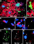 Figure 6. Myc-tagged Axin localizes in discrete spots and colocalizes with HA–Dsh. (A) Cellular distribution of FL Myc–Axin (green, Alexa488 staining) in Xenopus blastulae, detected by indirect IF on frozen sections. Myc–Axin localized mainly in spots (small arrows) or clusters of spots (large arrows), found generally but not exclusively at the cell periphery. Some plasma membrane staining was also observed (arrowhead). Red shows yolk platelets counterstained with Eriochrome Black; blue shows the nuclei (DAPI staining). (A′) Large cluster of Myc–Axin-positive spots (arrows) at higher magnification. (A′′) Detail of membrane localization of Myc–Axin (arrowheads). Spots also are found at or near the cell surface (arrow). (B and B′) Localization of FL Myc–Axin in transfected HeLa cells. Myc–Axin (red, Cy3 staining) is found in spots, mostly at the cell periphery. In high expressing cells, bright cytoplasmic clusters were observed (B′, arrows). (B′′) Detail of two clusters at high magnification (arrows). Note that images in A and A′′ and B and B′′ were collected under very different conditions (exposure, filters), since the signal was one order of magnitude stronger in transfected HeLa cells compared with mRNA-injected embryos. Blue shows the nuclei (DAPI staining). (C and C′) Colocalization of FL Myc–Axin and HA–Dsh. Coexpressed Myc–Axin (green, Alexa488 staining) and HA–Dsh (red, Cy3 staining) were detected on sections from Xenopus blastulae by double IF. All Myc–Axin colocalized perfectly with HA–Dsh (arrowheads), but some HA–Dsh spots did not stain for Myc–Axin (arrows). Note that most Axin-Dsh spots are distributed along the periphery of the cells. (D) Localization of HA–Dsh expressed alone: Dsh (red, Cy3 staining) localizes in spots, distributed throughout the cytoplasm. Blue shows nuclei (DAPI). Bars: (A) 10 μm; (A′) 2 μm; (A′′) 5 μm; (B and B′) 10 μm; (B′′) 5 μm; (C and D) 20 μm. |