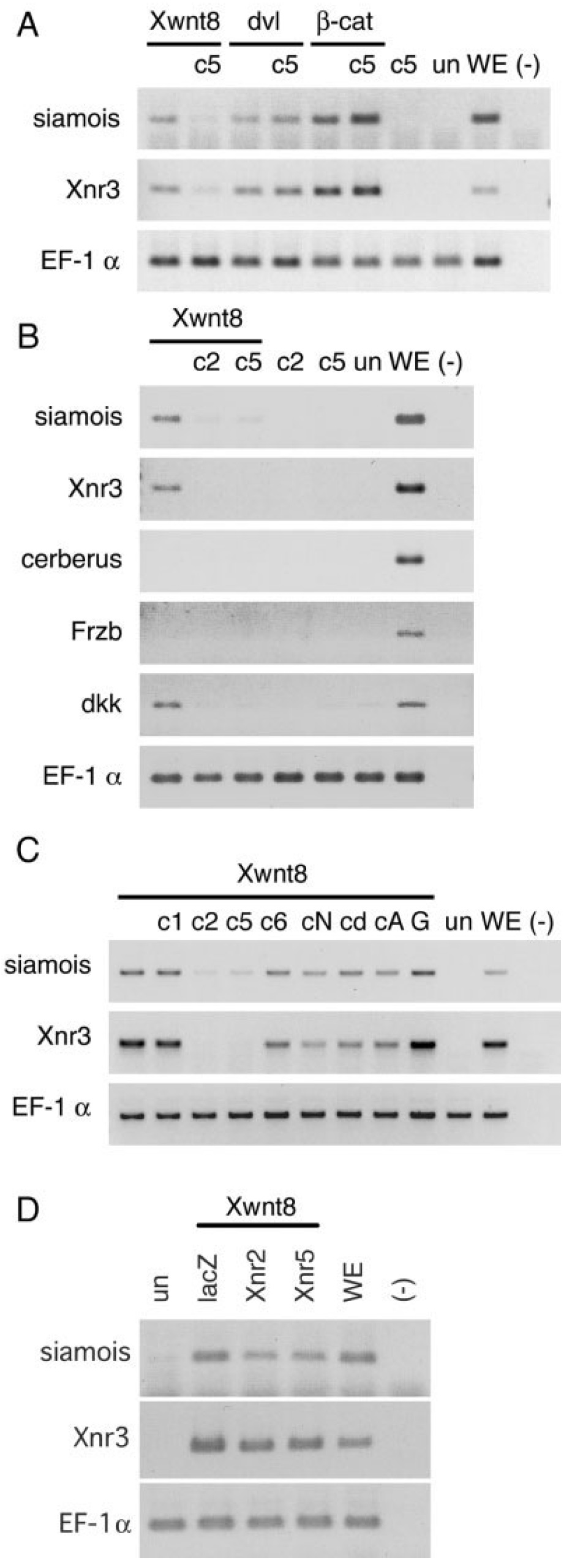 the expression of siamois and Xnr3 induced by Xwnt8. C: RT-PCR of animal caps co-injected with