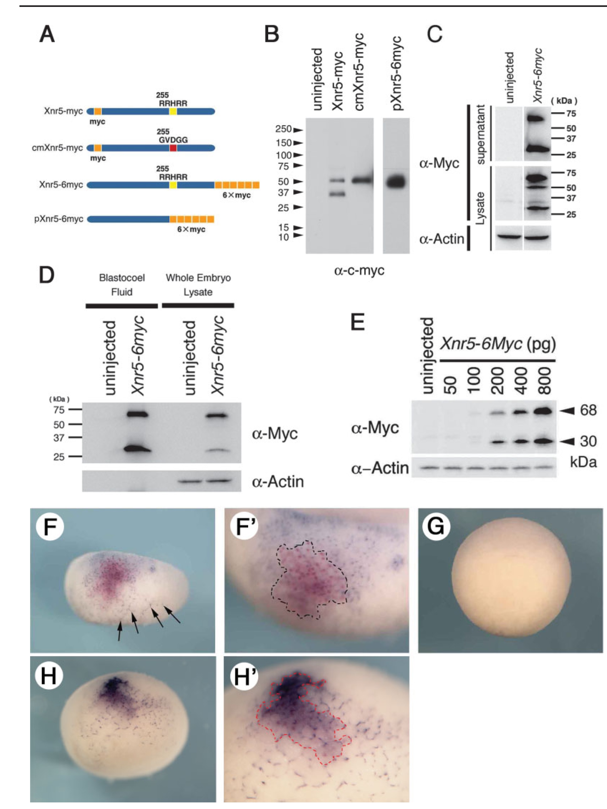 was used as a loading control. E: Western blot analysis of extract of embryos at stage 10. Injected amounts of Xnr5-6myc RNA are indicated at the