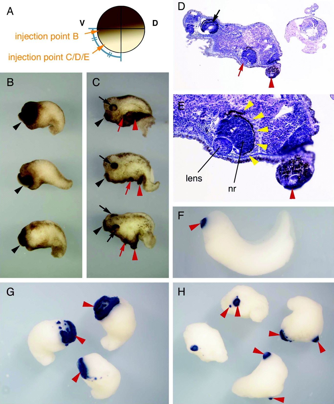 Figure 1. cmXnr5 induced a hyperplastic cement gland or an ectopic head structure formation with a single eye and a cement gland. A: Scheme of the injection points of cmXnr5 RNA. The injection point B is the marginal region of two ventral-vegetal blastomeres near the ventral cross point of the first and the third cleavage lines. The injection point C/D/E is the approximately half region between the vegetal cross point of the first and the second cleavage lines and the ventral cross point of the first and the third cleavage lines in both ventral-vegetal blastomeres at 8-cell stage. Each injection point is correspondent to B or C/D/E, respectively. B: Embryos were injected with 500 pg of cmXnr5 RNA into the marginal region (injection point B). Embryos had shortened body axis and a hyperplastic cement gland (arrowhead). C: Embryos were injected with 1 ng of cmXnr5 RNA into the prospective ventral endoderm region (injection point C/D/E). Embryos had an ectopic eye (red arrow) and a cement gland (red arrowhead) at stage 40. The original eye and cement gland are indicated by the black arrow and arrowhead, respectively. D: Histological section of the embryo injected with 1 ng of cmXnr5 RNA into the prospective ventral endoderm region. An ectopic eye (red arrow) and a cement gland (red arrowhead) were observed in the ventral region. E: The embryo in D at high magnification. The ectopic eye showed normal structure with retinal pigment epithelium (yellow arrowhead), neural retina (nr), and lens. F-H: The expression of cement gland marker XCG1. F: An uninjected albino embryo stage 35. G: Embryos injected with 1 ng of cmXnr5 RNA into the marginal region (injection point B). H: Embryos injected with 1 ng of cmXnr5 RNA into the prospective ventral endoderm region (injection point C/D/E). Whole-mount in situ hybridization was performed according to Harland ([1991]).