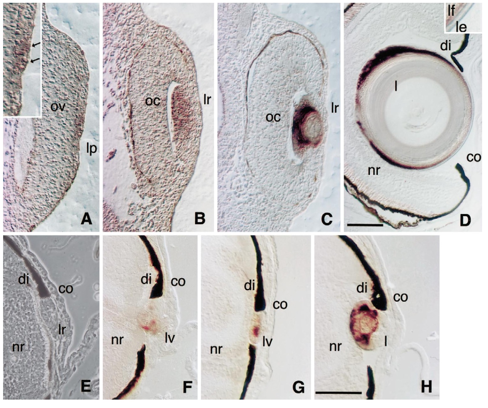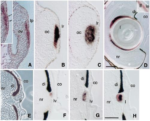 Fig. 3A–H In situ hybridization of sections through the eye region