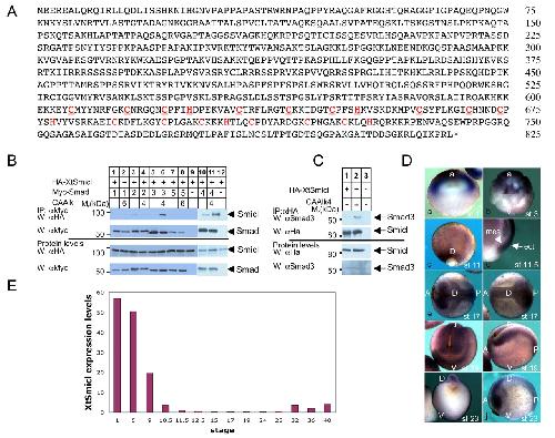 Fig. 1. Smicl is a Smad-interacting protein that is expressed maternally and then zygotically during Xenopus development. (A) Amino acid sequence of XtSmicl, a novel Smad interacting protein. Conserved cysteines and histidines in the zinc fingers are underlined. (B) Smicl interacts with Smad3 and Smad4. HA-tagged XtSmicl was expressed in HEK293T cells with plasmids encoding Myc-tagged Smad1, Smad2, Smad3, Smad4 or Smad5 in the presence or absence of the appropriate constitutively active type I receptor. Samples were immunoprecipitated (IP) using an anti-Myc antibody and the presence of HA-XtSmicl was analysed by western blotting (W). (C) Smicl interacts with endogenous Smad3. HA-tagged XtSmicl was expressed in HEK293T cells in the presence or absence of caALK4. Samples were immunoprecipitated with anti-HA coupled beads and the presence of endogenous Smad3 was analysed by western blotting. (D) Expression pattern of Xenopus tropicalis Smicl studied by whole-mount in situ hybridisation. Stages (st) are indicated. a, animal; v, vegetal; D, dorsal; V, ventral; A, anterior; P, posterior; mes, mesoderm; ect, ectoderm. Smicl is expressed maternally and transcripts are particularly abundant in the animal hemisphere of the fertilised egg. These results were confirmed by in situ hybridisation experiments carried out on bisected embryos to facilitate penetration of the probe in the vegetal hemisphere of the embryo. In situ hybridisation using a sense probe revealed no background staining (data not shown). (E) Quantitative RT-PCR confirms the presence of high levels of Smicl RNA in the fertilised egg of Xenopus tropicalis. Significant zygotic expression of Smicl begins at tadpole stage 32.
