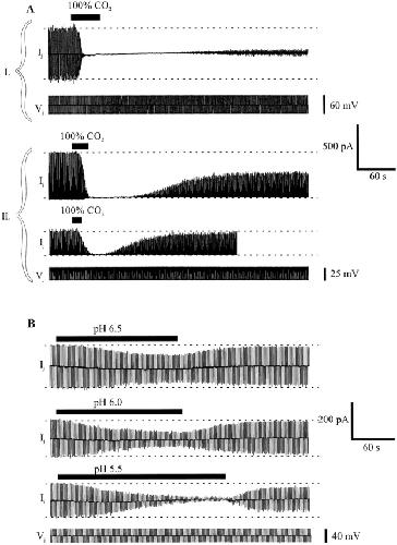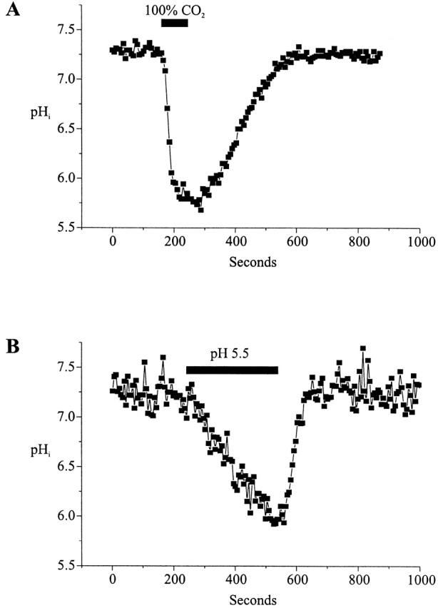 Figure 3. Measurement of intracellular pH in Cx46-transfected Neuro-2a cells. pHi was measured using the acidic form of BCECF. Single cells were whole-cell patch clamped with BCECF added to the patch pipette solution. (A) Application of CO2-equilibrated medium for 90 s decreased pHi to ∼5.8 within 50 s. However, recovery was much slower and lasted for almost 300 s. (B) pHi steadily decreased from 7.25 to ∼6.0 with a 300-s application of a medium acidified to pH 5.5 with HCl. Recovery after washout was complete within ∼100 s.