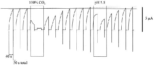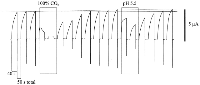 Figure 4. Cx46 hemichannels in Xenopus oocytes are sensitive to both internal and external pH. Shown are consecutive depolarizing voltage steps to +30 mV applied to a Xenopus oocyte expressing Cx46. The cell was held at −70 mV between voltage steps. The duration of each voltage step was 40 s and the interval between voltage steps was 50 s. The periods the oocyte was exposed to either 100% CO2-equilibrated medium or HCl-acidified pH 5.5 medium are bounded by rectangles. Hemichannel currents responded rapidly to application of 100% CO2 solution in the fourth depolarization and were abolished within ∼80 s of the application. Washing with pH 7.5 bathing media led to full recovery within four depolarizations. Hemichannel currents were also decreased with application of pH 5.5 HCl acidified medium during the 13th depolarization. By the next depolarization, Cx46 currents were reduced more. Hemichannel currents recovered by the third depolarization after solution exchange with original pH 7.5 bathing medium. The solid horizontal line marks the level of the activation of Cx46 hemichannels before any treatment. The dashed line approximates the increase in peak current with time, which is probably due to continued expression of new Cx46 hemichannels.