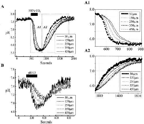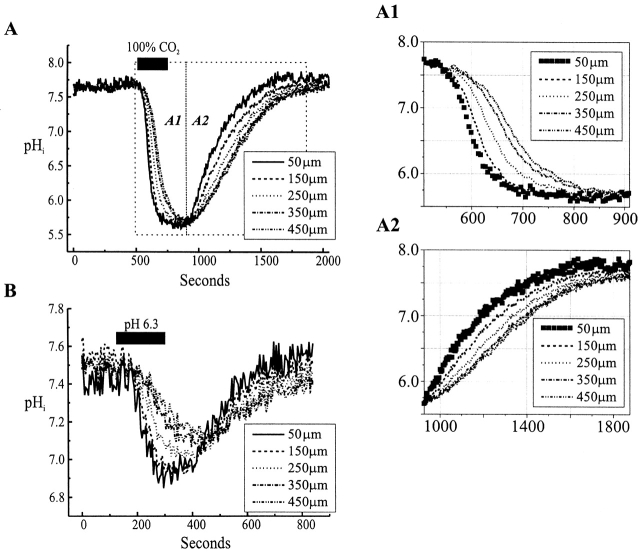 Figure 5. Measurement of pHi in Cx46 expressing Xenopus oocytes during application of medium (A) equilibrated with 100% CO2 and (B) adjusted to pH 6.3 with HCl. pHi was monitored with BCECF and recorded at five distances from the edge of the oocyte, ranging from 50 to 450 μm. Experimentally, these values were obtained by placing 100-μm circular “regions of interest” (ROI) centered at the specified distances on the acquired image of the oocyte and replaying the saved acquisition. During image acquisition, the objective was focused on the oocyte's perimeter. With a large, round oocyte, this focal plane would pass through the center of the oocyte, although with considerable light scatter. The ratiometric determination of pH in this plane will include some signal from the periphery above and below the center of the oocyte, but the image from the perimeter of the oocyte will include entirely peripheral cytoplasm. Thus, there is a significant difference in the amount of signal contributed from deep within the oocyte cytoplasm as the ROI is moved away from the perimeter. The slower change in pH towards the center of the oocyte was observed consistently, but eventually the pH reached the same value in the center as at the periphery. (A) A 4-min application of 100% CO2-equilibrated medium lowered pHi from ∼7.6 to ∼5.8. An enlarged view (A1) shows how the kinetics of intracellular acidification slows with increasing distance from the oocyte periphery. The same steady state value of pHi was reached in all cases before recovery was initiated by washing. Similar kinetics was seen with recovery (A2). (B) An ∼3-min application of HCl-acidified pH 6.3 medium also lowered pHi. Again, the effects were faster at the edge of the oocyte. With the duration of the application shown, pHi decreased less at the center of the oocyte.