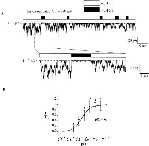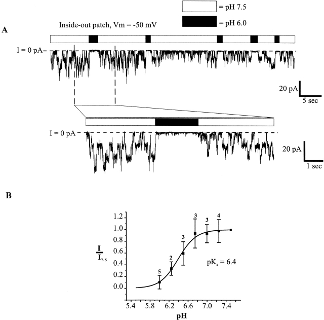 Figure 6. Cx46 hemichannels in excised patches retain sensitivity to pH. (A) An inside-out patch that was placed in a stream composed of pH 7.5 IPS-A. With the holding potential of −50 mV, hemichannel openings are downward deflections in current. Rapid switching to pH 6.0 IPS-A led to a sharp decrease in the open probability of the four active hemichannels in the patch. This example shows no transitions to the fully open state while the patch was in the pH 6.0 stream. The exploded view of one application reveals the rapid closure of two open channels and no subsequent openings for the duration of the application. Upon switching back to pH 7.5, the hemichannels returned to normal gating behavior. I = 0 pA denotes the leak conductance of the patch. (B) A fit of the Hill equation to averaged data from several patches. The mean and SD of I/I7.5 are plotted against pH. The number of low pH exposures used to obtain mean current ratios is displayed above each point. The Hill equation fit to the data was of the form: The parameters from the fit were k = 4.04 × 10−7 M (pKa of 6.4) and n = 2.3.