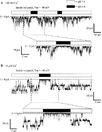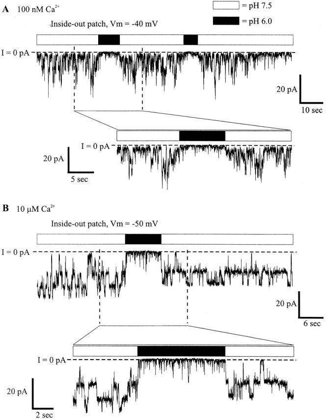 Figure 7. Cx46 hemichannels are equally sensitive to pH with [Ca2+] at 100 nM and 10 μM. IPS-B (2 mM BAPTA) was used for all solutions, with added CaCl2 adjusted to give 100 nM and 10 μM [Ca2+]. IPS-B with 100 nM [Ca2+] was used as the pipette filling solution in both cases. (A) Rapidly switching from pH 7.5 to 6.0 with 100 nM [Ca2+] significantly lowered the open probability of the three active channels in the patch. Few full reopenings are seen during the low pH application. I/I7.5 = 0.1. (B) With 10 μM [Ca2+] solutions, Cx46 hemichannel open probability was similarly reduced with pH 6.0 applications. I/I7.5 = 0.08. I = 0 pA denotes the leak conductance of the patch; channel openings are downward deflections in current.