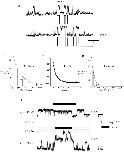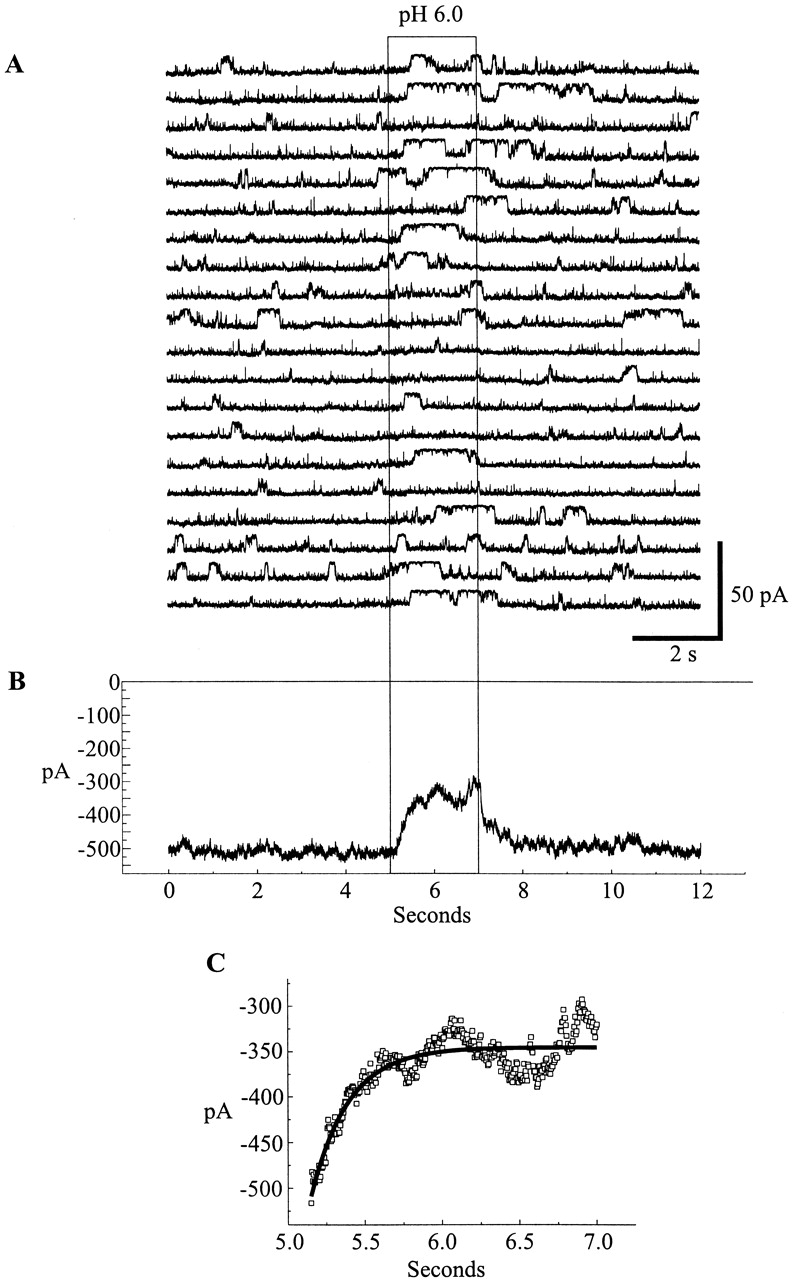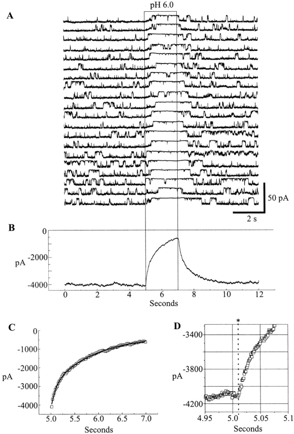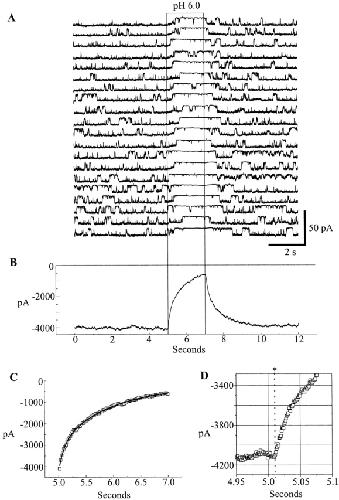 Figure 8. Ensemble currents show the time course of pH- induced closure. (A) An inside-out patch held at −30 mV and containing a single Cx46 hemichannel was subjected to repeated 2-s applications of pH 6.0 IPS-A (region within the rectangle). Hemichannel openings are downward deflections in current. The beginning of each 12-s trace immediately followed the end of the previous trace. (B) Summation of the currents from the patch shown in A, together with 112 more traces from four other patches at −30 mV containing multiple channels. (C) A sum of two exponentials fitted to the pH 6.0 induced decay of ensemble currents. The time constants of the decay were 110 and 935 ms, and the constant parameter of the fit was −232 pA. (D) An enlarged view showing the time of solution switching (denoted by the dashed line) in comparison with the onset of ensemble current decay. There was no delay between pH 6.0 application and current decrease.