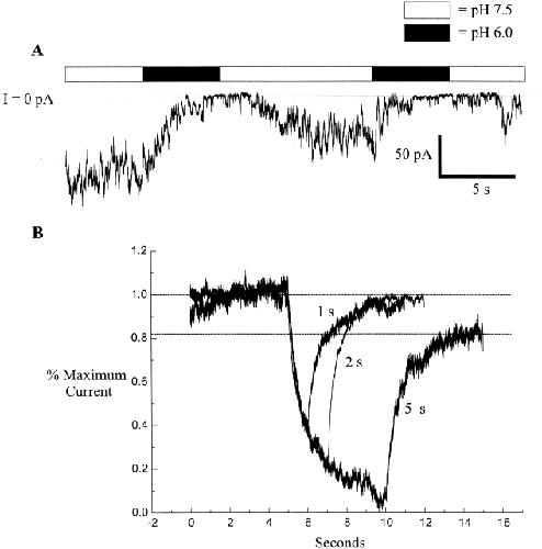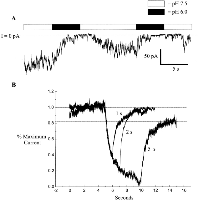 Figure 9. Ensemble currents show the effect of the duration of acidification on the extent of recovery. (A) An inside out patch held at −30 mV and containing at least 20 Cx46 hemichannels was subjected to two applications of pH 6.0 for 5 s each. After each application, the number of active channels was markedly reduced. (B) Ensemble currents from multiple patches were normalized to the average of the currents over the 5 s before acidification. The 1-s ensemble is the sum of 96 pH 6.0 applications from three patches, the 2-s ensemble is the sum of 132 applications from five patches (the same as in Fig. 8), and the 5-s ensemble is the sum of 31 applications from a total of five patches. Recovery from 1- and 2-s applications is nearly 100%, whereas recovery from 5-s applications is only ∼80%.
