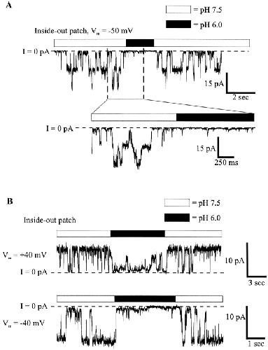 Figure 10. (A) Application of low pH to the cytoplasmic face of Cx46 hemichannels in inside-out patches decreases channel open probability whether the application occurs when the Cx46 hemichannel is open or closed. In this example, taken from the same patch depicted in Fig. 6, rapid solution switching to pH 6.0 followed a spontaneous closure. During the remainder of the application, channel open probability was reduced, and no full reopenings were evident. Opening is downward and I = 0 pA is the leak conductance of the patch. (B) The open probability of Cx46 hemichannels during pH 6.0 applications exhibits moderate voltage dependence. An inside-out patch held at +40 mV was exposed to pH 6.0 for a brief time. Closure occurred soon after application, but there were several brief reopenings to a reduced conductance during the low pH exposure. At −40 mV, there were no complete openings while the patch was exposed to pH 6.0. I = 0 pA is the leak conductance of the patch.