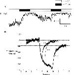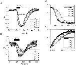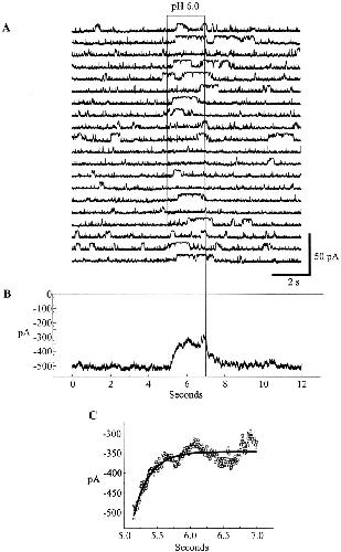 Figure 11. Ensemble currents from an outside-out patch reveal a much lower sensitivity to extracellular pH 6.0 applications. (A) An outside-out patch containing a single Cx46 hemichannel was repeatedly exposed to pH 6.0 IPS-A. Hemichannel open probability is not as reduced as with pH 6.0 applications to the cytoplasmic face of the channel. (B) Summation of the 20 traces displayed in A with 30 additional traces from the same patch (not shown). (C) An exponential fitted to the pH 6.0 induced ensemble current decrease. The time constant of decay was 241 ms, and the constant parameter of the fit was −336 pA.