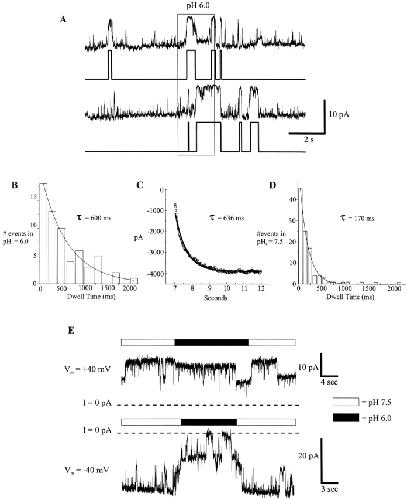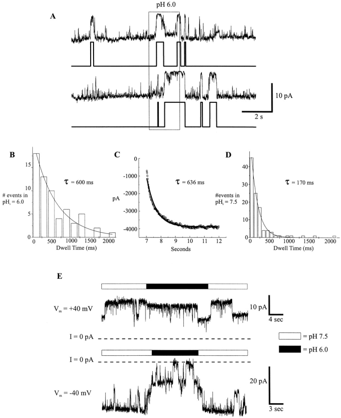 Figure 12. Comparison of Cx46 hemichannel closed times during application of pH 7.5 and 6.0 to an outside-out patch. (A) Example of two current idealizations obtained using the Sublevel Hinkley detector set to low sensitivity. Channel openings are downward deflections in current. Traces are from the same patch as in Fig. 11. Closed times were categorized as pH 7.5 closed times or pH 6.0 dwell times according to the condition in which the event began. (B) Dwell-time histogram of the closed times at pH 6.0 compiled for all 50 traces of the same patch. The histogram was fitted to a single exponential to give a mean closed time of 600 ms. (C) The recovery of the ensemble currents shown in Fig. 8 B after rapidly switching to pH 7.5 from a 2-s application of pH 6.0 was fitted by a single exponential with a time constant of 636 ms, which represents the mean latency to first opening. (D) Dwell-time histogram of the closed times at pH 7.5. A single exponential fit to the distribution gave a mean closed time of 170 ms. Due to the smaller number of events at pH 6.0, binning was increased to 200-ms intervals, compared with 100-ms intervals for pH 7.5 events. (E) Comparison of pH 6.0 applications to an outside-out patch held at +40 and −40 mV. There was an ∼10–15% single channel conductance decrease at +40 mV, but very little change in the open probability of the two channels in the patch (I/I7.5 ≅ 0.91). The pH 6.0 application at −40 mV occurred after one of the channels had already closed. The open probability of the two channels was markedly reduced (I/I7.5 ≅ 0.4). The opening events during the pH 6.0 application may be attributable to both channels. I = 0 pA denotes the leak conductance of the patch.