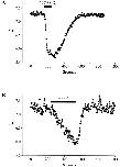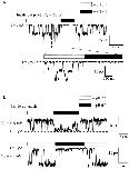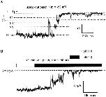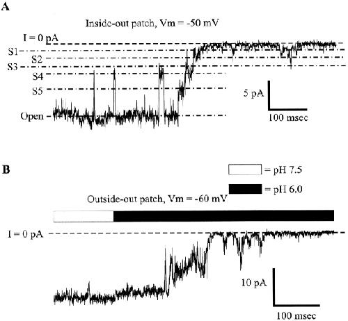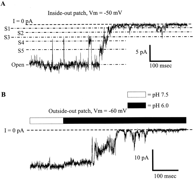 Figure 13. Transitions from fully open to fully closed states are slow for both pH-induced and hyperpolarization-induced closures. (A) A single Cx46 hemichannel in an inside-out patch held at −50 mV transited from fully open to fully closed over the course of ∼50 ms. Numerous transitions among discrete substates are evident. Dash-dot lines indicate putative substate levels. (B) Rapidly switching from pH 7.5 to 6.0 IPS-A caused full closure of a single Cx46 hemichannel in an outside-out patch. Closure did not initiate for >100-ms after the solution exchange, and required >100 ms to complete. The channel reopened fully during this application (not shown). The full closing transition is very noisy with no clearly resolvable substates.
