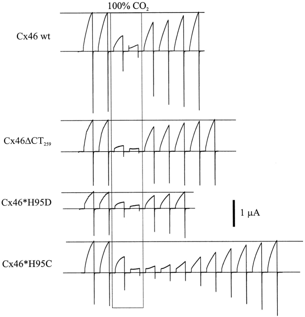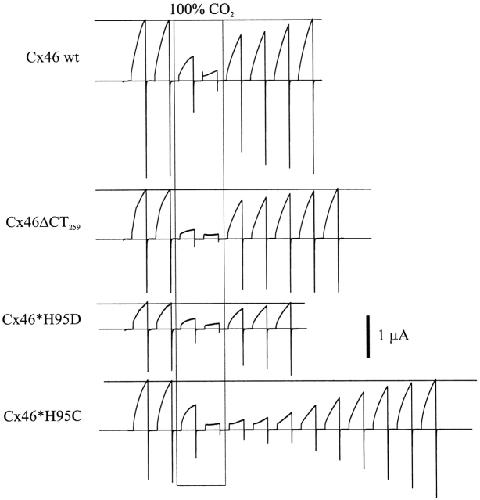 Figure 14. Mutations shown to affect the pH sensitivity of Cx43 have little effect on Cx46. Hemichannel currents were induced by a series of 20-s depolarizing voltage steps separated by 70 s; the displayed interval between steps is truncated to 10 s for clarity. Voltage was held at −60 mV between depolarizing steps. In all cases, medium equilibrated with 100% CO2 was applied between the second and third depolarizations, and was washed out after the fourth depolarization. Wild-type Cx46 currents were nearly abolished with medium equilibrated with 100% CO2. Cx46ΔCT259, a mutant lacking 82% of the COOH terminus, and the mutant Cx46*H95D hemichannel behaved similarly to wild-type Cx46. Full recovery for these three hemichannel types occurred, on average, by the fourth episode after washout. The small variation in the time to full recovery seen among these three different hemichannel types was similar to that seen for oocytes expressing the same hemichannel type (n = 4, data not shown). In contrast, the mutant Cx46*H95C hemichannel, while similarly sensitive to CO2 application, recovered considerably more slowly upon washout, requiring twice as long as the three previous hemichannel types. Hemichannel currents were elicited by voltage steps to +5 mV for wild-type Cx46 and Cx46*H95D, +10 mV for Cx46ΔCT259, and +15 mV for Cx46*H95C.
