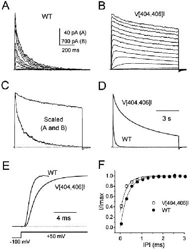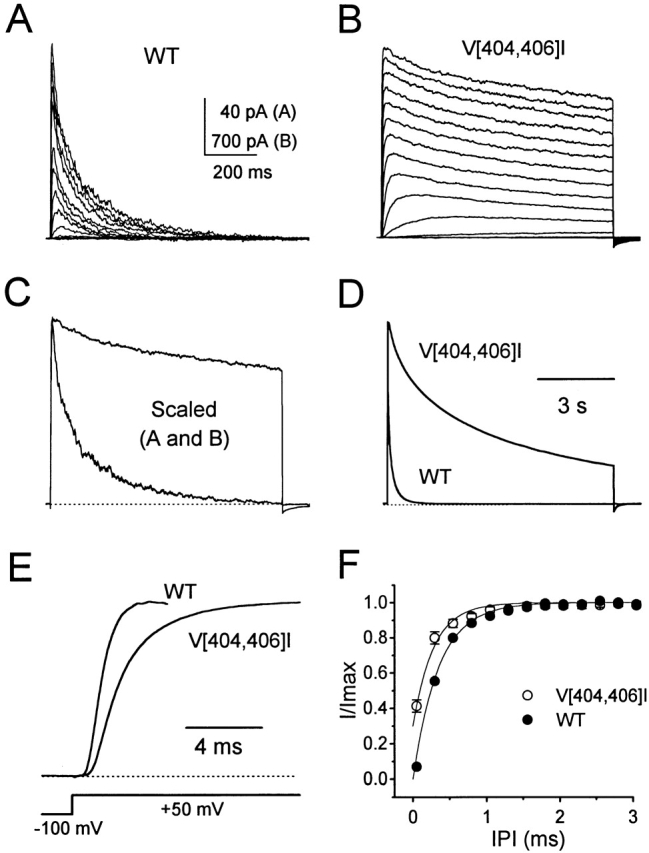Figure 2. Macroscopic currents recorded from Xenopus oocytes expressing Kv4.1 K+ channels. (A) Wild-type macropatch outward currents evoked by 900-ms step depolarizations from a holding potential of −100 mV to test potentials from −80 to +60 mV in 10-mV increments (the displayed currents are the average of three consecutive runs). The interpulse interval was 5 s. (B) V[404,406]I outward currents evoked as described in A. Recordings in A and B were obtained in the cell-attached configuration of the patch-clamp method (materials and methods). (C) Comparison of normalized currents at +60 mV from A and B. (D) Normalized whole-oocyte outward currents evoked by a 9-s step depolarization to +50 mV from a holding potential of −100 mV. (E) The rising phase of the macroscopic currents evoked as described in C. For comparison, the currents are shown normalized. These currents were low-pass filtered at 2.5 kHz and digitized at <100 μs/point (the displayed currents are the average of 15 consecutive runs). (F) The time course of recovery from inactivation at −100 mV. This experiment recorded whole-oocyte currents elicited by a double pulse protocol. From a holding potential of −100 mV, a step depolarization to +40 mV evoked the control current and allowed inactivation to occur (500 ms for wild-type channels and 9 s for mutant channels). After a variable interval (interpulse interval [IPI]) at the same holding potential, a second 250-ms pulse was delivered to test for the recovery of the current. The interepisode interval was 5 s. The peak value of the current evoked by the second pulse is divided by that of the current evoked by the first pulse. The graph shows this ratio as a function of the IPI. The open symbols and bars represent the means ± SD of three experiments. To compare the same interpulse intervals, the graph shows a single experiment from wild type (for additional results see Table I). These data were described assuming an exponential rise (solid lines). The best-fit estimates of the time constants were 343 and 265 ms for wild-type and mutant channels, respectively.
