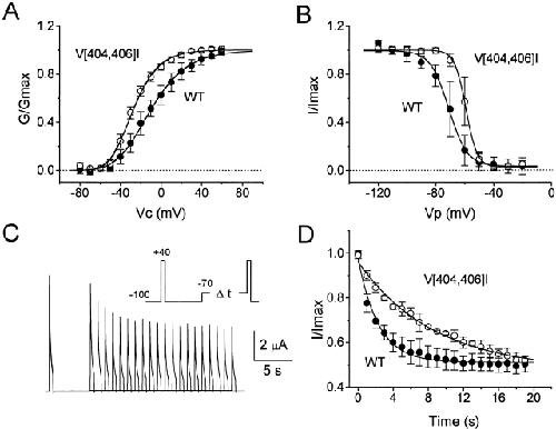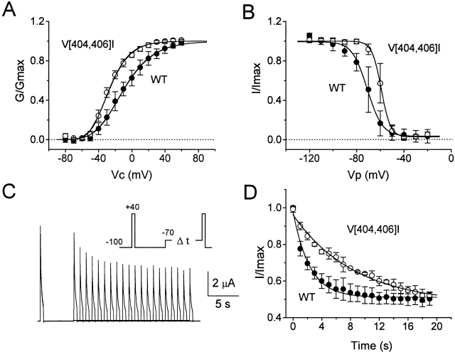 Figure 3. Activation and inactivation properties of macroscopic Kv4.1 currents. (A) The peak G/V relation. The experiments were conducted as described in Fig. 2 (A and B). The peak chord conductance (G) was calculated according to this relation: G = Ip/ (Vc − Vr), where Ip is the peak current, Vc is the command voltage (from −80 to +60 mV), and Vr is the reversal potential of the current (−95 mV). The peak G/V relation was described assuming a fourth order Boltzmann distribution (Zagotta et al., 1994). For comparison and display, G is divided by Gmax (the estimated maximal conductance) and plotted against the membrane potential (command voltage). The symbols and bars represent the means ± SD of nine and seven patches from oocytes expressing wild-type and mutant channels, respectively. The solid lines represent the best-fit fourth-order Boltzmann distributions. The best-fit parameters were: V0.5 = −47 mV and slope factor = 22 mV/e-fold, for the wild-type channels; and V0.5 = −53 mV and slope factor = 15 mV/e-fold, for the mutant channels. (B) Prepulse inactivation curves. The prepulse inactivation protocol consisted of a sequence of two pulses: a 10-s prepulse that was varied between −120 and −10 mV in 10-mV increments and a 250-ms test pulse to +40 mV. The holding potential during the interepisode interval (5 s) was −100 mV. The peak of the current evoked by the test pulse was plotted against the prepulse voltage. This relation was described assuming a Boltzmann distribution. For comparison and display, Ip is divided by Imax (the maximal control current) and plotted against the prepulse potential. The symbols and bars represent the means ± SD of five and seven patches from oocytes expressing wild-type and mutant channels, respectively. The solid lines represent the best-fit Boltzmann distributions. The best-fit parameters were: V0.5 = −71 mV and slope factor = 6 mV/e-fold, for the wild-type channels; and V0.5 = −59 mV and slope factor = 3.5 mV/e-fold, for the mutant channels. (C) The time course of prepulse inactivation of wild-type channels at −70 mV. The pulse sequence is shown in the inset. From a holding potential of −100 mV a control 500-ms pulse to +40 mV was delivered to obtain the control current. This pulse was followed by a 5-s interval at −100 mV (to recover from inactivation that developed during the first pulse). Then, the membrane was held for a variable interval at a prepulse potential (∼V0.5 of prepulse inactivation) before delivering a 500-ms test pulse to +40 mV. The interepisode interval was 5 s. (D) Comparison of the time courses of prepulse inactivation from wild-type and V[404,406]I channels at their corresponding midpoints voltages of prepulse inactivation. Graph displays the relation between the normalized current (I/Imax) and the duration of the prepulse. Symbols and bars represent the means ± SD (wild-type: n = 3; V[404,406]I: n = 4). The data were described assuming an exponential decay (solid lines). The best-fit estimates of the time constants were 2.3 and 6.7 s for wild-type and mutant channels, respectively.
