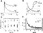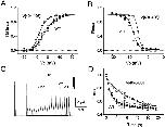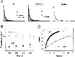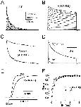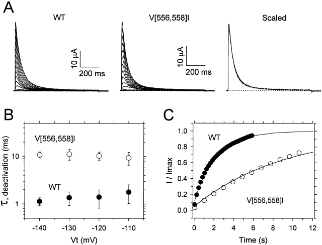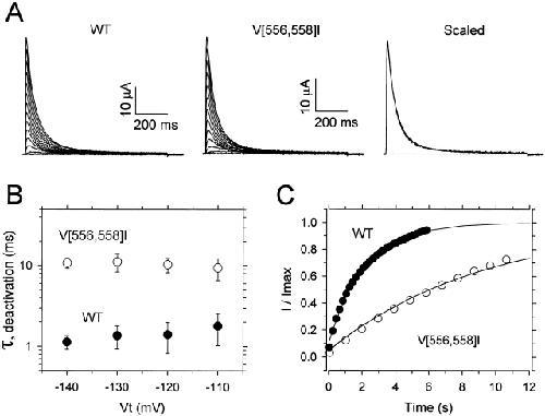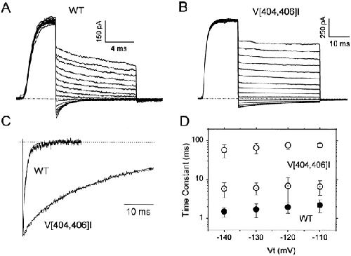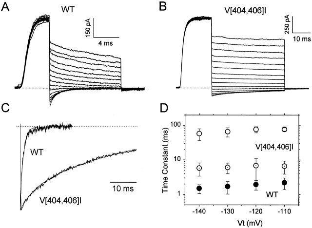 Figure 4. Deactivation kinetics of Kv4.1 K+ currents. (A) Wild-type tail currents. After a pulse to +50 mV to activate the current, the membrane was repolarized to membrane potentials between −140 and 0 mV in 10-mV increments. The interepisode interval was 5 s. (B) V[404,406]I tail currents. Currents evoked as described for A. (C) Scaled and superimposed tail currents from A and B at −140 mV. The thin solid lines through the traces are the best fit exponential (wild type) or biexponential curves (V[404,406]I). The estimated time constants were 1.2 ms for wild-type, and 5 (19%) and 41 (81%) ms for V[404,406]I. The numbers in parenthesis are the relative weights of the exponential terms. (D) Time constants of the tail current relaxations as a function of membrane potential. The dotted symbols represent the fast time constants and the open symbols represent the slow time constants.