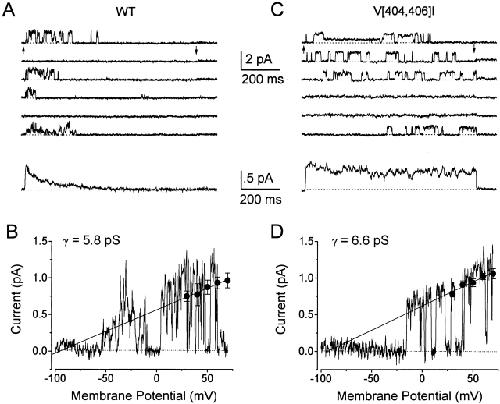 Figure 5. Kv4.1 single channel currents. (A and C) Consecutive single channel traces evoked by a step depolarization to +50 mV from a holding potential of −100 mV. The dotted line represents the closed level, and the arrows indicate the beginning and end of the depolarizing pulse. Note rapid flickering and unresolved openings in the wild-type traces, and a more stable open state in the mutant traces. A clear sublevel is resolved in the first mutant trace. The excessively prolonged latency to the first opening in the last mutant trace was not consistently observed (see results). The corresponding ensemble average currents (n = 64 traces) are displayed in the lower part of A and C. All recordings were obtained in the cell- attached configuration. (B and D) The single channel current–voltage relations of Kv4.1 channels. Two methods were used to measure the unitary conductance (γ): (a) by ramping the membrane potential between −100 and +70 mV or (b) by determining the mean unitary current (from amplitude histograms) at various membrane potentials (+30, +40, +50, +60, and +70 mV). Because of rapid flickering and the presence of apparent subconductance levels in the recordings from wild-type channels, only well-resolved full openings were considered in this analysis (note that the mean unitary amplitudes appear slightly underestimated). The solid lines across the currents and the symbols are linear regression fits to the mean values of the unitary currents. Symbols and bars represent the mean ± SD (n = 3 and 4 patches in B and D, respectively).