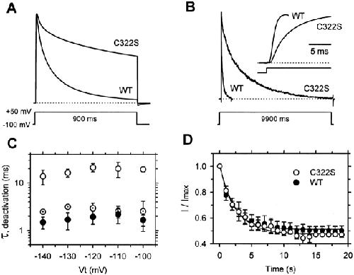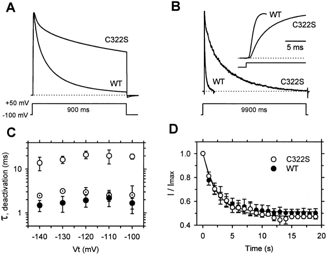 Figure 6. Macroscopic properties of C322S channels. (A) Whole-oocyte outward currents evoked by a 900-ms step depolarization to +50 mV from a holding potential of −100 mV. (B) Macropatch outward currents evoked by a 9.9-s step depolarization to +50 mV from a holding potential of −100 mV (C322S only). Mutant and wild-type currents in A and B are shown normalized. The inset shows the rising phase of the currents at +50 mV. The dotted lines in A and B represent the zero current level. (C) Time constants of tail current relaxations. The experiments were conducted and analyzed as described in Fig. 4. The mutant current relaxations were best described assuming the sum of two exponential terms (open and dotted symbols). The wild-type values are replotted from Fig. 4. Symbols and bars represent the mean ± SD (C322S, n = 6). (D) Time course of prepulse inactivation. This experiment was conducted and analyzed as described in Fig. 3. For C322S channels, the prepulse potential was −68 mV. The time course corresponding to C322S channels (open symbols) was described assuming an exponential decay (τ = 2.6 s). The data for wild type are replotted from Fig. 3. Symbols and bars represent the mean ± SD (C322S, n = 3).