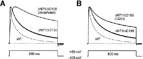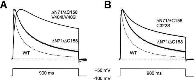 Figure 7. Macroscopic inactivation of Kv4.1 channels in the presence and absence of the cytoplasmic NH2- and COOH-terminal domains. Whole-oocyte currents were elicited by the indicated pulse protocol. All traces are shown normalized. The biophysical properties of the double deletion mutant (ΔN71/ΔC158) were characterized in a previous study (Jerng and Covarrubias, 1997).