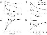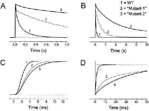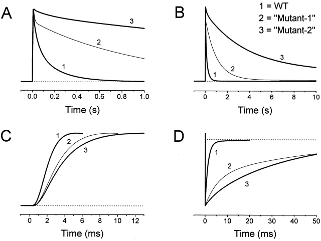 Figure 9. Simulated K+ currents according to Scheme III. (A) Outward currents generated by assuming a 1-s voltage-step from −100 to +50 mV. The parameters of the simulation were as shown in Table III. The key for the calculated traces is shown on the right-hand side of B. To calculate the “Mutant-1” trace, only the closing rate k−1 was reduced (39.5 s−1). To calculate the “Mutant-2” trace, the parameters were adjusted to approximate V[404,406]I currents (Table III). The decay of the calculated wild-type (WT) current is well described assuming a sum of three exponential terms: τ1 = 17 ms (0.2), τ2 = 60 ms (0.4), and τ3 = 250 ms (0.4); the sustained level was <0.01 (relative weight of the exponential term in parentheses). These values are consistent with the results of the analysis of Kv4.1 inactivation (Table I). The degree of inactivation of the simulated Mutant-2 current [I(450 ms)/Ipeak] is 0.8, which is 10-fold higher than the value calculated from the WT current. These values are also in agreement with observations (see text). (B) Outward currents generated by assuming a 10-s voltage step from −100 to +50 mV. (C) The rising phase of the calculated outward currents shown in A. The T50% of the WT and Mutant-2 traces are 1.8 and 3.2 ms, respectively, and the corresponding activation delays were 1.2 and 1.5 ms (see text). Similar values were measured from the observed currents. (D) Inward tail currents generated by assuming a protocol similar to that described in Fig. 4 (Vtail = −140 mV). The WT and Mutant-2 currents can also be described assuming exponential relaxations with time constants that agree with the observations (Fig. 4). Dotted lines represent the zero current level.