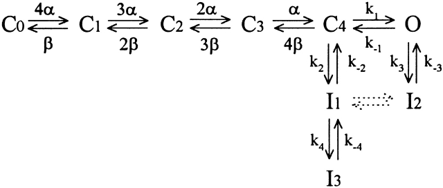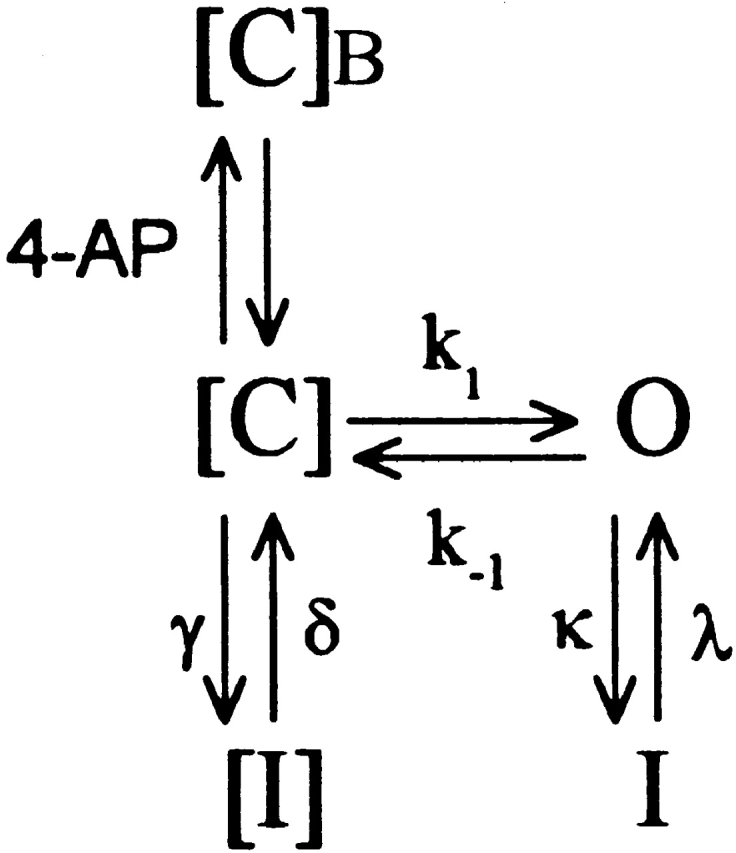 Kv4 channels represent the main class of brain A-type K+ channels that operate in the subthreshold range of membrane potentials (Serodio, P., E. Vega-Saenz de Miera, and B. Rudy. 1996. J. Neurophysiol. 75:2174- 2179), and their function depends critically on inactivation gating. A previous study suggested that the cytoplasmic NH2- and COOH-terminal domains of Kv4.1 channels act in concert to determine the fast phase of the complex time course of macroscopic inactivation (Jerng, H.H., and M. Covarrubias. 1997. Biophys. J. 72:163-174). To investigate the structural basis of slow inactivation gating of these channels, we examined internal residues that may affect the mutually exclusive relationship between inactivation and closed-state blockade by 4-aminopyridine (4-AP) (Campbell, D.L., Y. Qu, R.L. Rasmussen, and H.C. Strauss. 1993. J. Gen. Physiol. 101:603-626; Shieh, C.-C., and G.E. Kirsch. 1994. Biophys. J. 67:2316-2325). A double mutation V[404,406]I in the distal section of the S6 region of the protein drastically slowed channel inactivation and deactivation, and significantly reduced the blockade by 4-AP. In addition, recovery from inactivation was slightly faster, but the pore properties were not significantly affected. Consistent with a more stable open state and disrupted closed state inactivation, V[404,406]I also caused hyperpolarizing and depolarizing shifts of the peak conductance-voltage curve ( approximately 5 mV) and the prepulse inactivation curve (>10 mV), respectively. By contrast, the analogous mutations (V[556,558]I) in a K+ channel that undergoes N- and C-type inactivation (Kv1.4) did not affect macroscopic inactivation but dramatically slowed deactivation and recovery from inactivation, and eliminated open-channel blockade by 4-AP. Mutation of a Kv4-specific residue in the S4-S5 loop (C322S) of Kv4.1 also altered gating and 4-AP sensitivity in a manner that closely resembles the effects of V[404, 406]I. However, this mutant did not exhibit disrupted closed state inactivation. A kinetic model that assumes coupling between channel closing and inactivation at depolarized membrane potentials accounts for the results. We propose that components of the pore's internal vestibule control both closing and inactivation in Kv4 K+ channels.