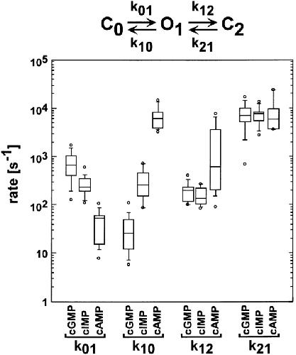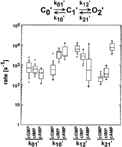 Figure 13. Box plots of rate constants for the C0′ ↔ C1′ ↔ O2′ scheme. Box plots of the k01′, k10′, k12′, and k21′ rate constants for the C0′ ↔ C1′ ↔ O2′ scheme from 14 different patches. Values for the rate constants were determined by HMM analysis. The horizontal line within each box indicates the median of the data, boxes show the 25th and 75th percentiles of the data, and whiskers show the 5th and 95th percentiles. Extreme data points are also indicated.