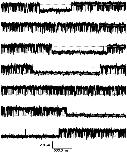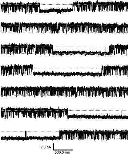 Figure 1. Bimodal single-channel activity. Shown are 23.33 s of a continuous current recording from a patch containing a single BROD CNG channel. The upper and lower dotted lines, separated by 2.1 pA, indicate the open and closed current levels, respectively. The currents were recorded at +80 mV in the inside-out configuration and in the continuous presence of 16 mM cGMP applied to the cytoplasmic face of the patch. The data were filtered at 5 kHz and sampled at 25 kHz.