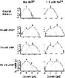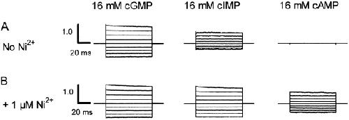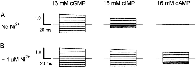 Figure 3. Macroscopic current– voltage families. Current families for an inside-out patch were elicited by 16 mM cGMP, 16 mM cIMP, or 16 mM cAMP in the presence (A) or absence (B) of 1 μM Ni2+. Voltage pulses were applied from 0 mV to potentials between −80 and +80 mV in 20-mV steps. Control currents in the absence of cyclic nucleotides were subtracted. The currents were normalized (using the +80-mV trace) to the maximum current in the presence of 16 mM cGMP and 1 μM Ni2+.