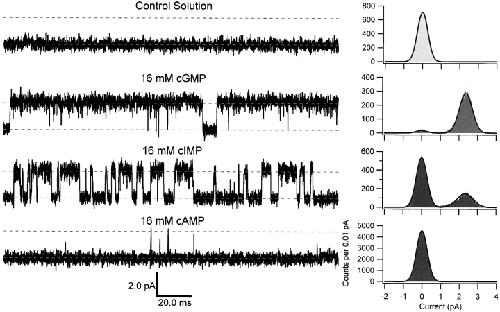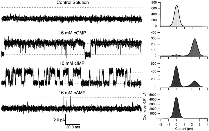 Figure 4. Representative single-channel currents. Single-channel currents were recorded in the presence of 16 mM cGMP, cIMP, or cAMP with the membrane voltage clamped at +80 mV. Each sweep was 200 ms in duration. The upper and lower dotted lines indicate the open and closed levels, respectively, and are separated by 2.3 pA. The amplitude histograms were normalized to unit area and were fit by the sum of two Gaussians with variances σclosed2 and σopen2 for the closed and open distributions, respectively. Parameters for amplitude histograms were as follows: control solution: σclosed = 280 fA; 16 mM cGMP: σclosed = 300 fA, Pclosed = 0.05, μopen = 2.4 pA, σopen = 349 fA, Popen = 0.95; 16 mM cIMP: σclosed = 289 fA, Pclosed = 0.71, μopen = 2.3 pA, σopen = 431 fA, Popen = 0.29; 16 mM cAMP: σclosed = 287 fA, Pclosed = 0.997, μopen = 2.4 pA, σopen = 500 fA, Popen = 0.003.