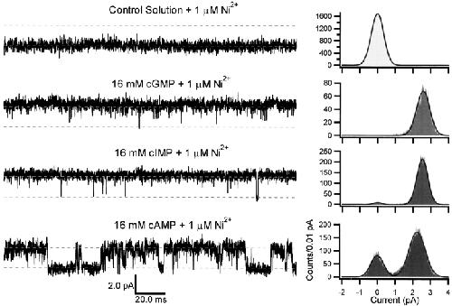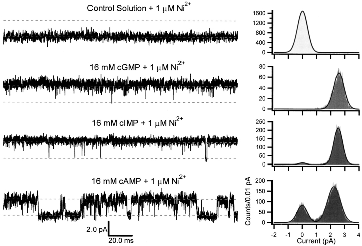 Figure 5. Representative single-channel currents in the presence of Ni2+. Single-channel currents were recorded in the presence of 16 mM cGMP, cIMP, or cAMP, and 1 μM Ni2+. Data are for the same patch as in Fig. 4. Each sweep was 200 ms in duration. The upper and lower dotted lines indicate the open and closed levels, respectively, and are separated by 2.3 pA. The amplitude histograms were normalized to unit area and were fit by the sum of two Gaussians. Parameters for amplitude histograms were as follows: control solution + 1 μM Ni2+: σclosed = 353 fA; 16 mM cGMP + 1 μM Ni2+: σclosed = 2 pA, Pclosed = 0.01, μopen = 2.5 pA, σopen = 374 fA, Popen = 0.99; 16 mM cIMP + 1 μM Ni2+: σclosed = 236 fA, Pclosed = 0.03, μopen = 2.5 pA, σopen = 311 fA, Popen = 0.97; 16 mM cAMP + 1 μM Ni2+: σclosed = 360 fA, Pclosed = 0.28, μopen = 2.3 pA, σopen = 457 fA, Popen = 0.72.