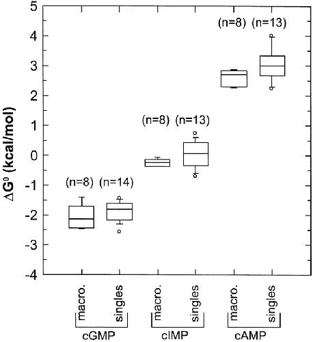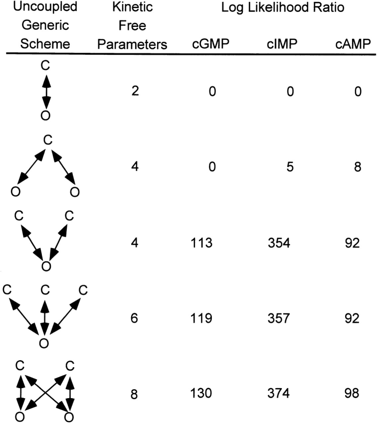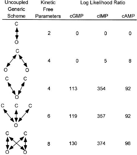 Figure 12. Model discrimination. Log likelihood ratios from an HMM analysis with five uncoupled generic schemes of single channel data recorded with 16 mM cGMP, cIMP, or cAMP. A convergence criterion of 10−8 was used. The log-likelihoods obtained from the analysis were normalized by subtracting the log-likelihoods obtained for the two-state C ↔ O scheme.