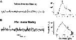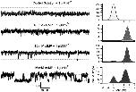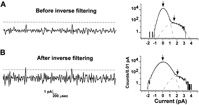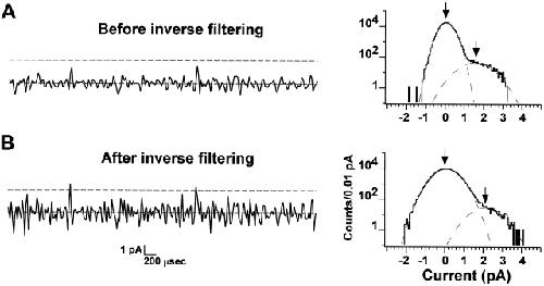 Figure 6. Effects of inverse filtering on cAMP openings. Representative cAMP current traces at +80 mV are shown before (A) and after (B) inverse filtering along with amplitude histograms shown on log-linear axes. The dotted lines on the traces are separated by 2.2 pA. The amplitude histograms were fit by the sum of two Gaussians, which appear as parabolas on log-linear axes. The fit parameters before inverse filtering were: μopen = 1.5 pA, σclosed = 0.29 pA, σopen = 0.65 pA, Popen = 0.006. The fit parameters after inverse filtering were μopen = 2.1 pA, σclosed = 0.49 pA, σopen = 0.61 pA, Popen = 0.004.