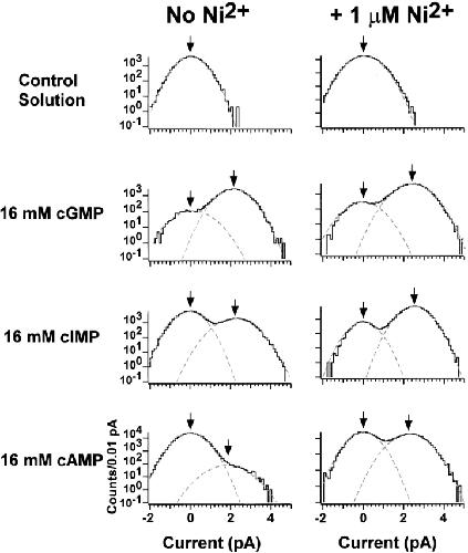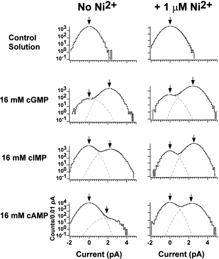 Figure 7. Amplitude histograms on log–linear axes with inverse filtering. The amplitude histograms were fit by the sum of two Gaussians, which appear as parabolas on a log scale. Parameters for the histograms in the absence of Ni2+ were as follows: control solution: σclosed = 480 fA; 16 mM cGMP: σclosed = 580 fA, Pclosed = 0.045, μopen = 2.2 pA, σopen = 590 fA, Popen = 0.955; 16 mM cIMP: σclosed = 490 fA, Pclosed = 0.71, μopen = 2.2 pA, σopen = 640 fA, Popen = 0.286; 16 mM cAMP: σclosed = 500 fA, Pclosed = 0.989, μopen = 2.0 pA, σopen = 960 fA, Popen = 0.011. Parameters for the histograms in the presence of Ni2+ were as follows: control solution + 1 μM Ni2+: σclosed = 520 fA; 16 mM cGMP + 1 μM Ni2+: σclosed = 590 fA, Pclosed = 0.036, μopen = 2.4 pA, σopen = 600 fA, Popen = 0.964; 16 mM cIMP + 1 μM Ni2+: σclosed = 470 fA, Pclosed = 0.071, μopen = 2.4 pA, σopen = 500 fA, Popen = 0.929; 16 mM cAMP + 1 μM Ni2+: σclosed = 510 fA, Pclosed = 0.525, μopen = 2.2 pA, σopen = 620 fA, Popen = 0.475.